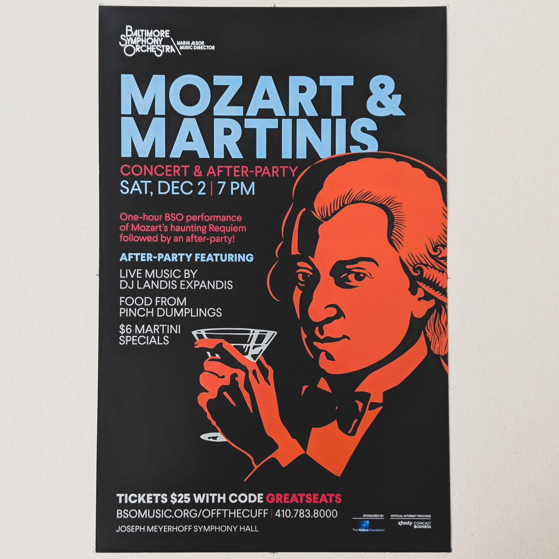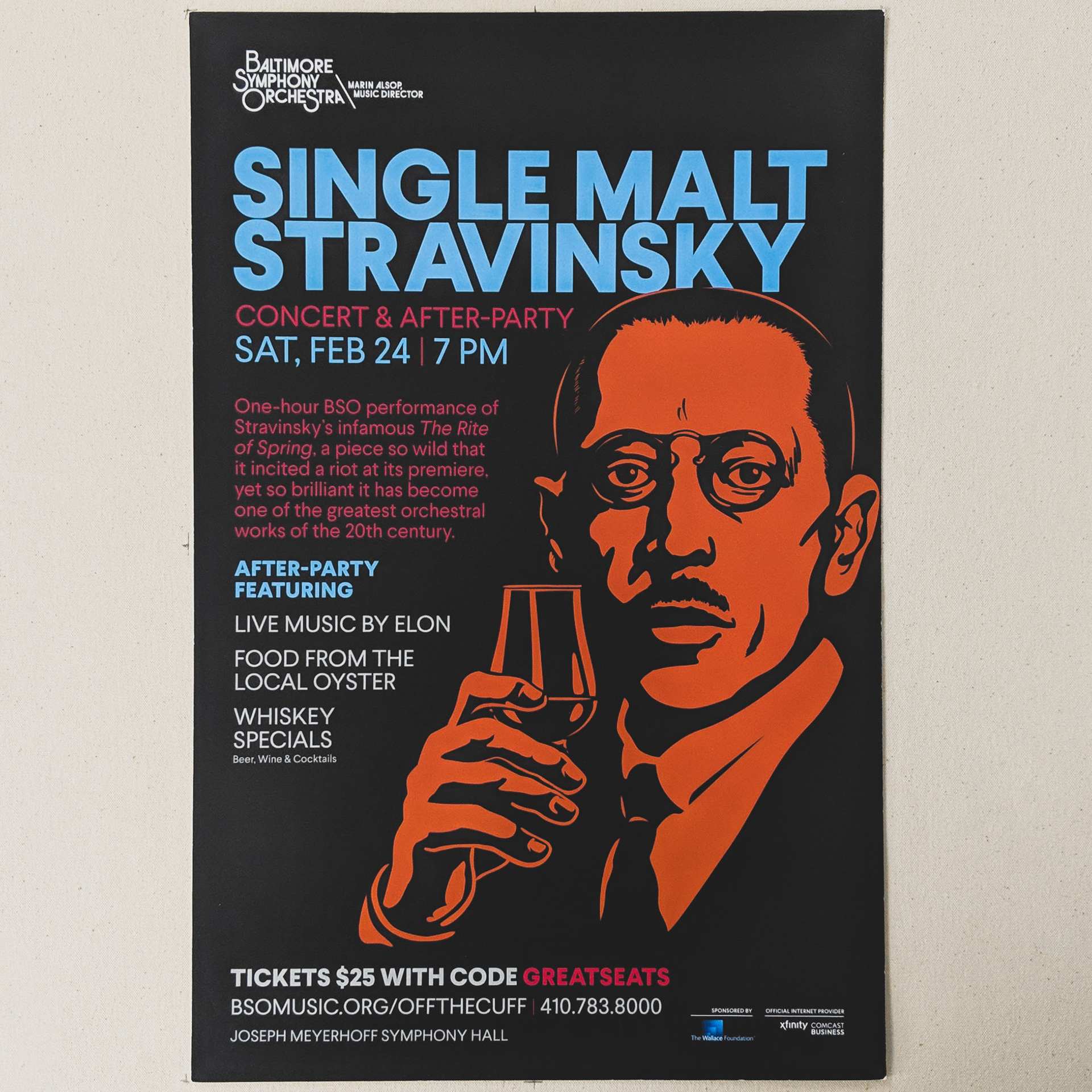 A series of posters and social media graphics to promote after-parties following Baltimore Symphony Orchestra's Off the Cuff 2017-18 concert series. Original portrait illustrations by me; cocktail illustrations via iStock.